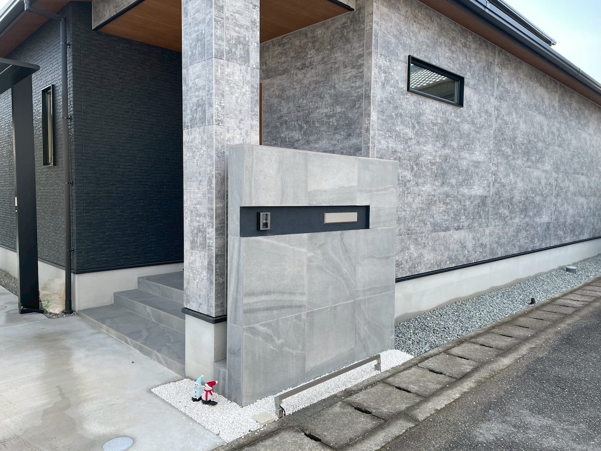 通常の300×600ではなく、600×600の大判タイルを採用した門柱は、建物と調和しながら強い存在感を演出。